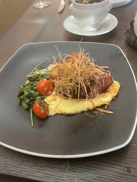 Our first night was all elegance—panoramic windows, piano music, and an incredible menu that delivered on flavor. We started our meal with a seared tuna appetizer with citrus crema and garlic chips. I chose the 24-hour beef short ribs served with bitter greens, au jus, and creamy polenta topped with apricot mostarda. My husband went with the filet mignon with whipped potatoes, asparagus, served with red wine demi-glace. We added a side of the chef’s blend of mushrooms to share with our meal. The food was terrific, and the experience was refined without being stuffy, ideal for lingering over conversation.