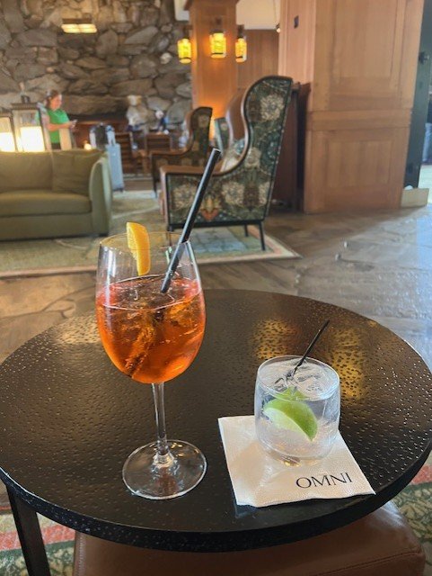 We kept finding our way back to the Great Hall, the heart of the resort, with soaring stone fireplaces and cozy seating. We settled into rocking chairs with cocktails—my favorite is the Aperol Spritz, while my husband enjoyed a Gin & Tonic—and we just talked. No phones, no deadlines, just time to catch up. It’s incredible what a crackling fire can do for a conversation.